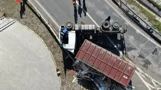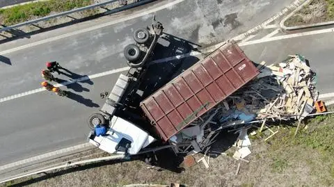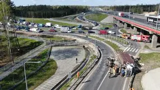 Ciężarówka z drewnem wywróciła się przy węźle Zielonka