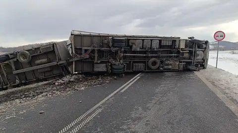 W poniedziałek, przed godziną 10, straż pożarna w Jaworze otrzymała zgłoszenie o przewróconej ciężarówce z przyczepą na obwodnicy Bolkowa.