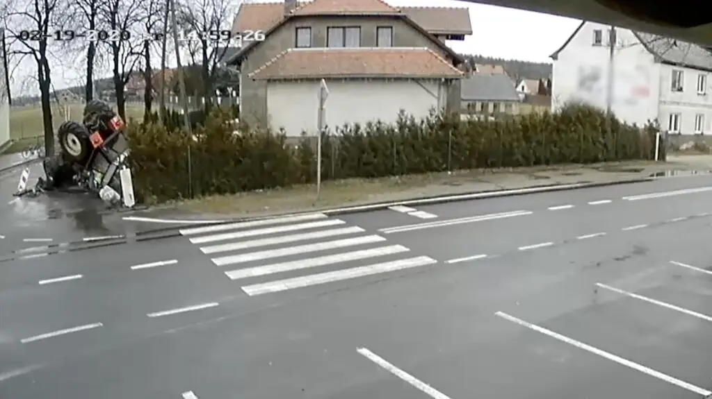 Choć zdarzenie wyglądało poważnie, to kierowcy nic poważnego się nie stało. Na nagraniu z drugiej kamery widać, jak mężczyzna wstaje o własnych siłach i wychodzi z kabiny przewróconego pojazdu.